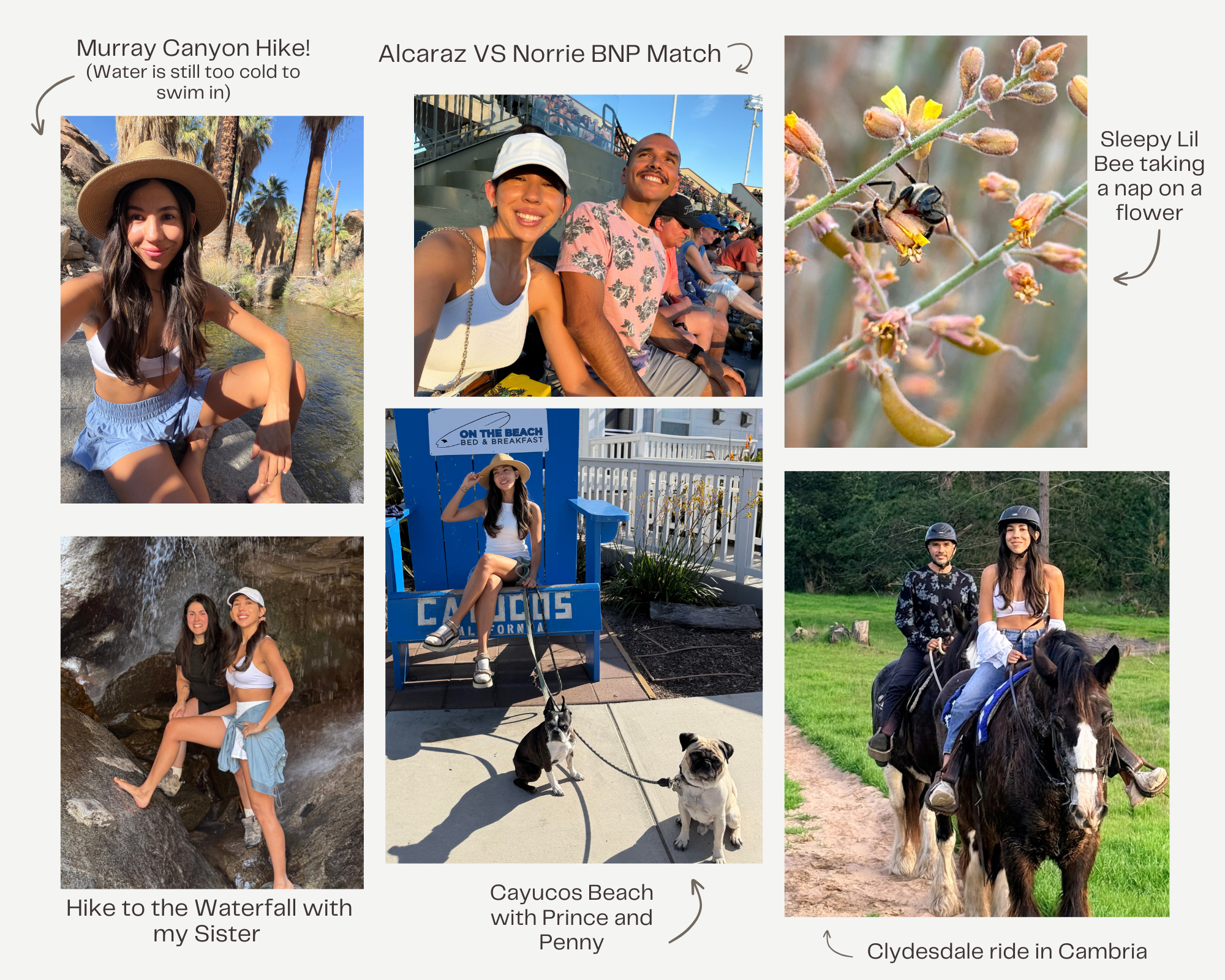Happy SPRING!! Lately I’ve been soaking up some really sweet, simple moments with friends and family getting outside more, enjoying the slightly warmer desert days, and admiring all the wildflowers that have started to pop up around the valley. It’s such a refreshing shift after winter. I’ve also been playing a lot of tennis and pickleball. Tennis, especially, has been humbling (to say the least), but it’s been really fun stepping into something new alongside Victor. We even got to watch some of the BNP Paribas Open matches, which felt like such a treat and definitely added a little inspiration to keep practicing!